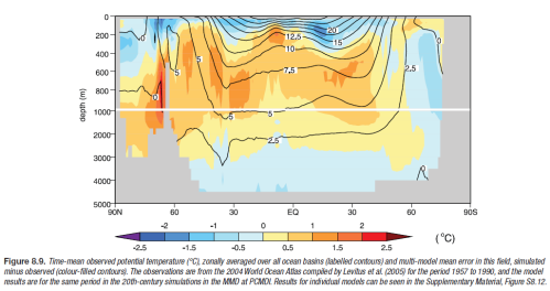 Ocean potential temperature, what’s that? Think of it as the real temperature with unstable up and down movements factored out, or read about potential temperature.. Note that the contours are the measurements (averaged over 34 years) and the shaded colors are the deviations of actual – model. So once again the light blue and light orange are very close to reality, the darker colors are further away from reality.