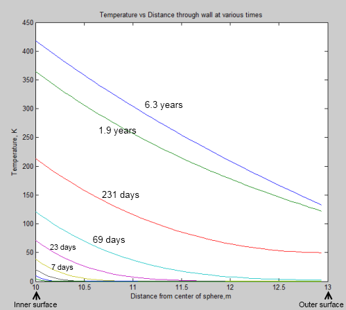 Now from scienceofdoom’s previous post we expect at least an initial heat flow rate out of the atmosphere of 158 W/m² (that’s the outgoing flow that balances incoming absorption on Venus – since we’ve lost incoming absorption to the opaque shell, this ought to be roughly the initial net flow rate). Dividing this into 500 GJ/m² gives a first-cut time estimate for the cooling: 3.2 billion seconds, or about 100 years. So the cool-down to isothermal would be hardly immediate, but still pretty short on the scale of planetary change.