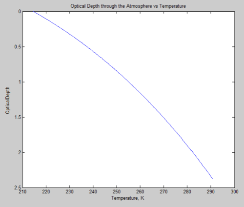 The second model I discussed with Science of Doom, Arthur, and others, relates to my suggestion that if an optical barrier prevented any solar energy from transmitting to the ground, but that the energy was absorbed in and heated a thin layer just below the average location of effective outgoing radiation from Venus, in such a way that the heat was transmitted downward through the atmosphere, this could also result in the hot lower atmosphere and surface that is actually observed. The albedo, and the solar heating input due to day and night, and to different latitudes, was selected to match the actual values for Venus, and the radiation out was also selected to match the values for the actual planet.