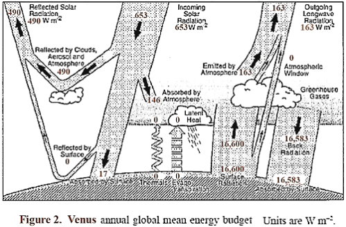 A sketch is shown in Figure 2, similar to the one used for Earth, which shows the approximate energy transfer in and out of the Venus atmosphere system. It is likely that almost all of the radiation out leaves from the top of the clouds and a short distance above, which therefore locks in the level of the atmospheric temperature at that location.