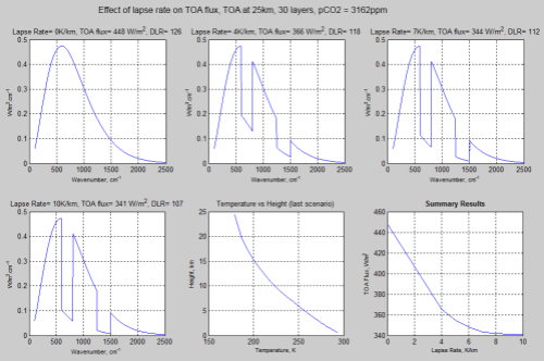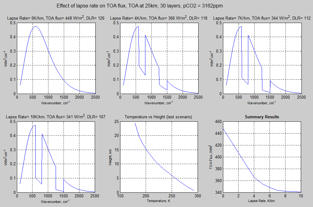 Part Four – the effect of changing lapse rates (atmospheric temperature profile) and of overlapping the pH2O and pCO2 bands. Why surface radiation is not a mirror image of top of atmosphere radiation.