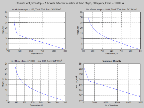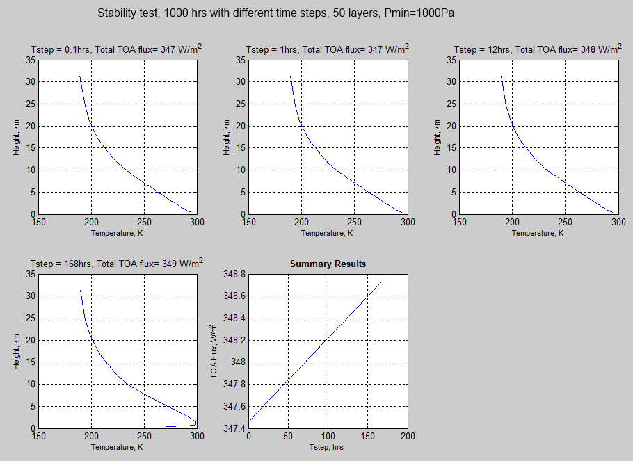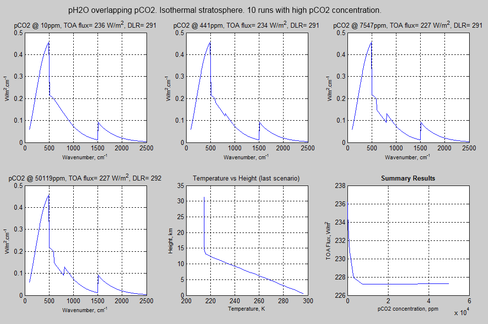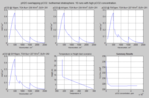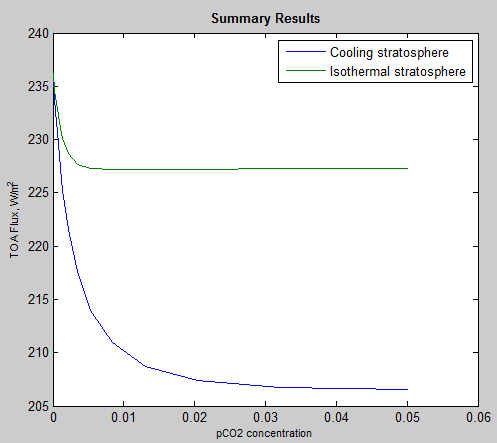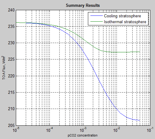The stratospheric temperature is fixed at 215K – to understand why I’ve chosen to fix it, see the discussion in Part Five.