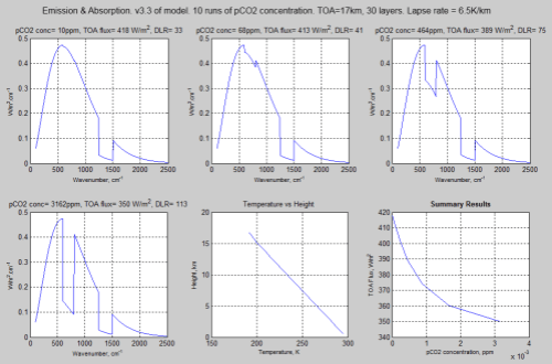 Then we see the effects of emitting from different heights in the atmosphere, and how changing temperature profiles (Part Four) affects that emission.
