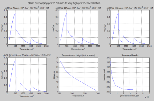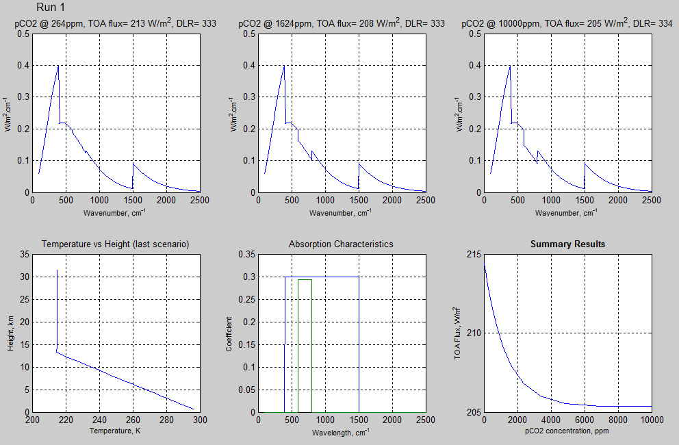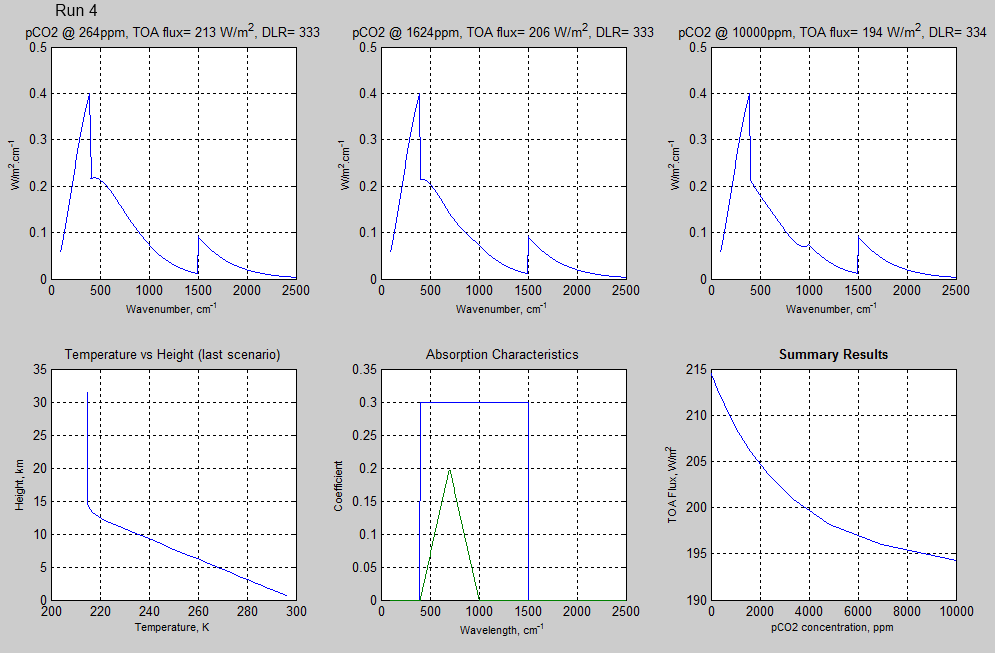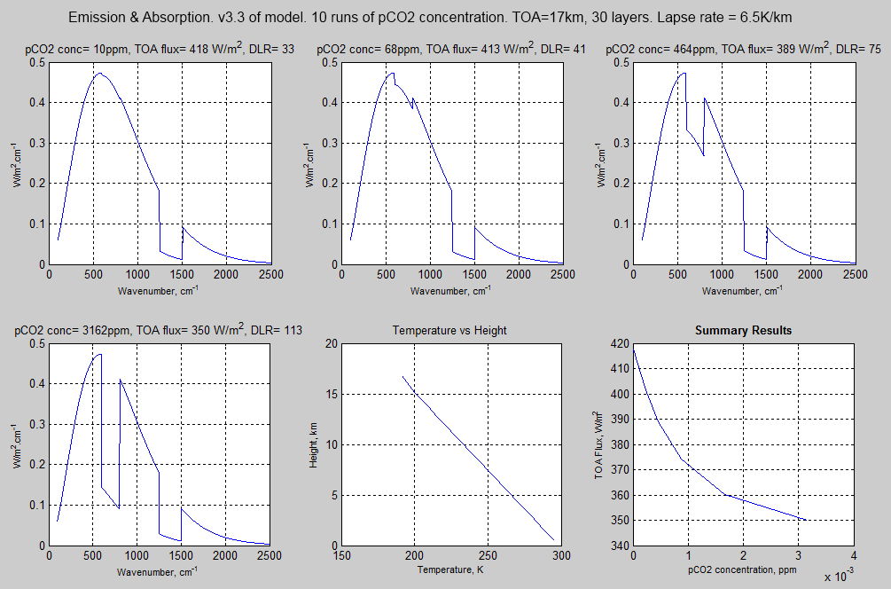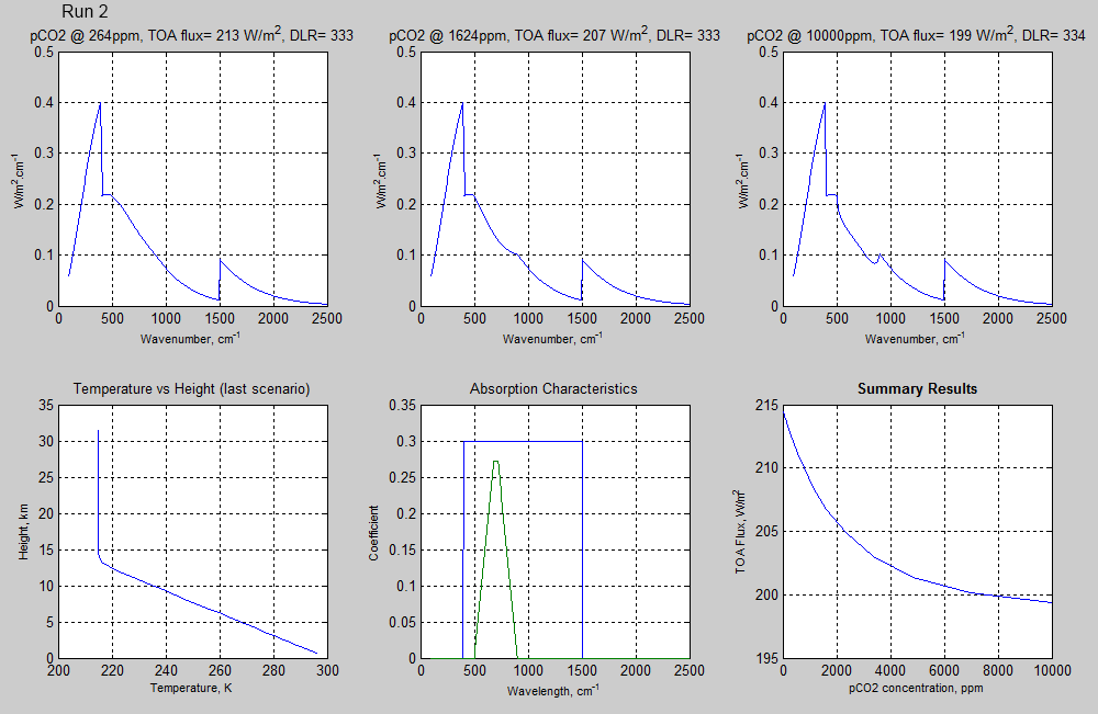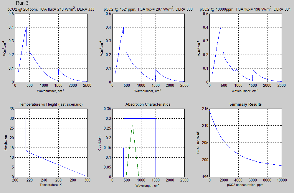 If you are new to the series, take a look at Part Two (and probably a good idea to take a look the subsequent parts to see how the model and the results develop). pH2O and pCO2 are not the real molecules, but have a passing resemblance to them. This allowing us to see changes in top of atmosphere (TOA) flux and DLR (back radiation) as they take on different characteristics, and as the concentration of pCO2 is changed.