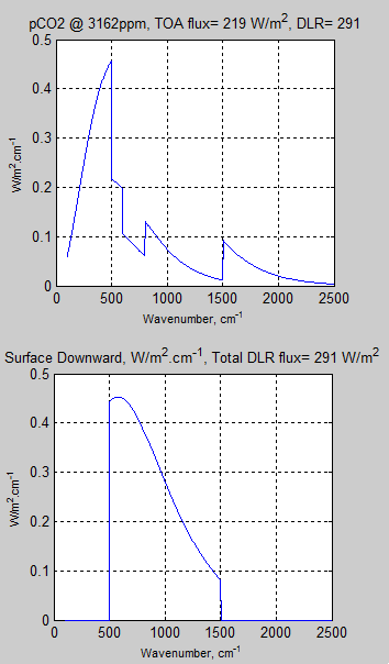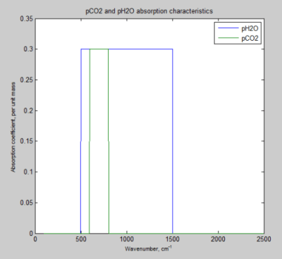 The reason for adding this complexity to the model is because real CO2 has an absorption band which is not “rectangular”. The band has a peak absorption around 667 cm-1 (15 μm) which then falls off on either side.