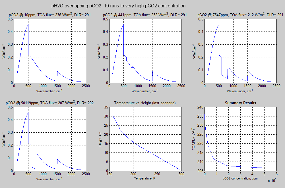 In Part Four we saw the effects of the pH2O band overlapping the pCO2 band. The models results in this article keep the same concept, but have widened the pH2O absorption slightly (extended to a lower wavenumber = higher wavelength).