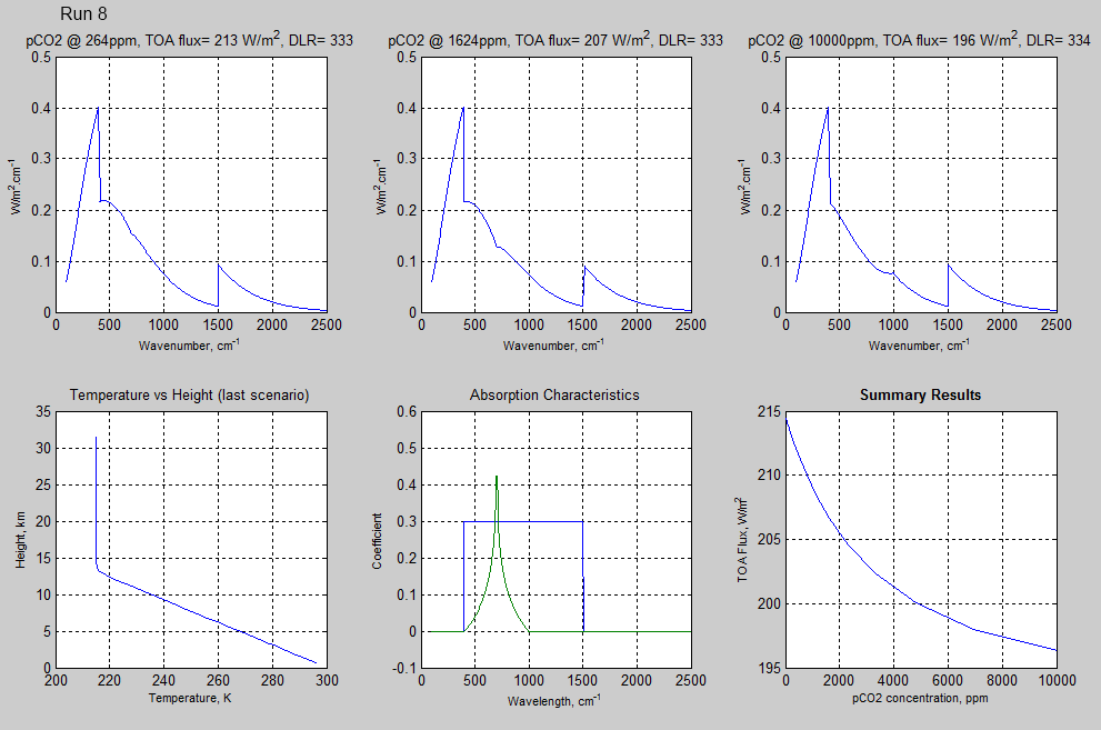 What happens is that the total band absorptance (the area under the curve) is the same for each run. The pCO2 absorption profile in Run 1 is the same as in all the previous articles in the series. Then in subsequent runs the edges of the band are widened, the “top” is made thinner, and the peak value is adjusted to keep the “total band absorptance” the same.