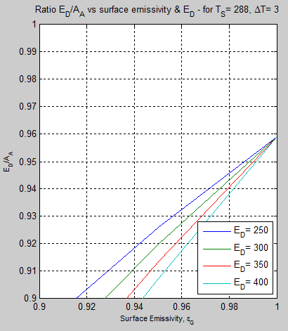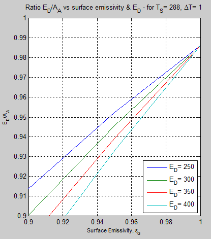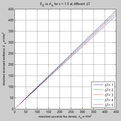 In these calculated results you can see that Downwards Emittance, ED is a little less than AA. In fact, it looks to be about 5% less on average. (And note that is ED = Absorbed Downwards Emittance)