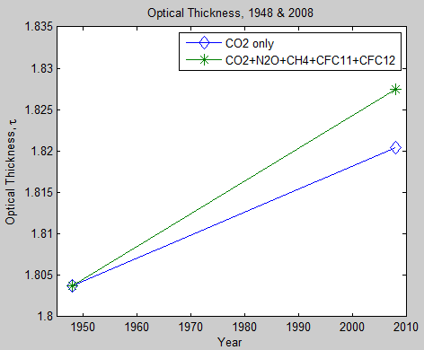 Part Six – Minor GHG’s – a less important aspect, but demonstrating the change in optical thickness due to the neglected gases N2O, CH4, CFC11 and CFC12.