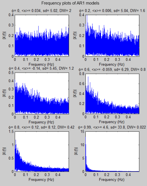 The first graph in the panel, with φ=0, is known as “white noise“. This means that the energy per unit frequency doesn’t change with frequency. As the autoregressive parameter increases you can see that the energy shifts to lower frequencies. This is known as “red noise“.