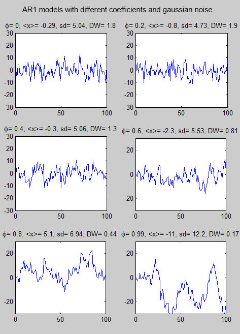 The value <x> is the mean. Note that the standard deviation (sd) of the data gets larger as the autoregressive parameter increases. DW is the Durbin-Watson statistic which we will probably come back to at a later date.