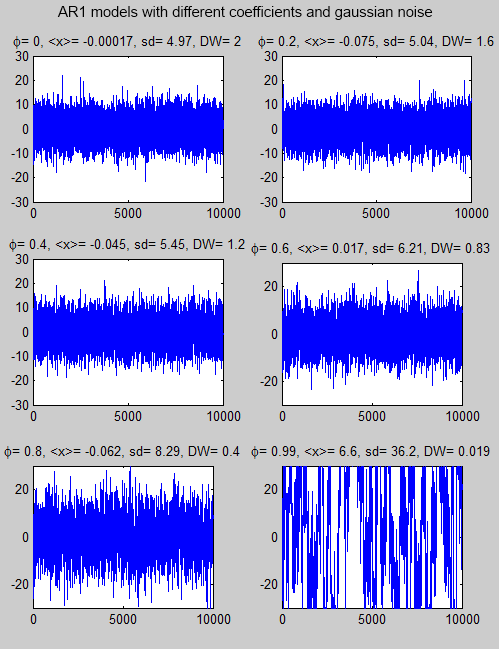 Here are some synthetic time-series with different autoregression parameters (the value φ in the equation) and gaussian (=normal, or the “bell-shaped curve”) noise. The gaussian noise is the same in each series – with a standard deviation=5.