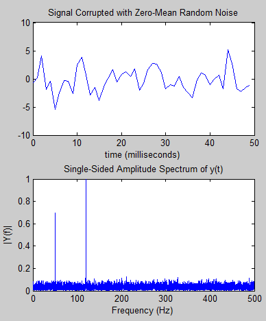 When we see the frequency transform in the 2nd graph we can immediately tell that the signal is made up of two sine waves – one at 50Hz and one at 120Hz – along with some noise. It’s not really possible to deduce that from looking at the time-domain signal (not for ordinary people anyway).