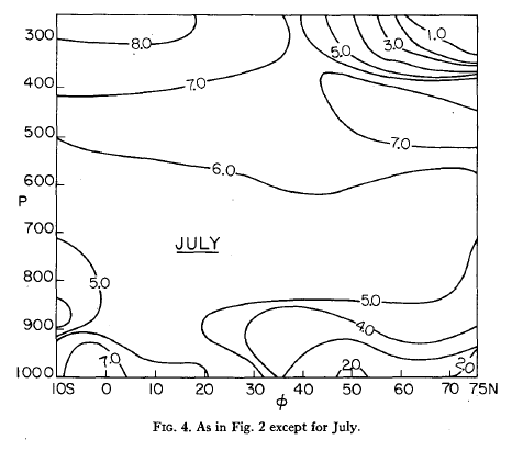 And of course, one of the biggest questions in an atmosphere with more CO2 is how water vapor concentration changes in response to surface temperature change. Changes in water vapor have multiple effects, but the one for consideration here is the change to the lapse rate. The dry adiabatic lapse rate is 9.8 °C/km, while the moist adiabatic lapse rate varies from 4 °C/km in the tropics near the surface (where the water vapor concentration is highest).