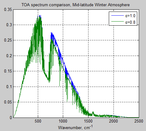 If we plotted separately the up and down flux we would find that they have a slope, but the slope of the up and down would be the same. Net absorption of radiation going up balances net emission of radiation going down – more on this in Visualizing Atmospheric Radiation – Part Eleven – Stratospheric Cooling.