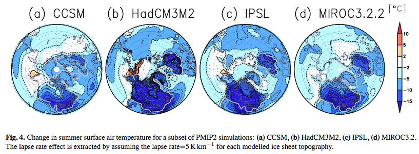 So the idea is to compare results with and without the actual ice sheet so see how much impact orbital and CO2 values have vs the effect of the ice sheet itself – and then for the ice sheet to see whether the albedo or the elevation has the most impact. Why the elevation? Well, if an ice sheet is 1km thick then the surface temperature will be something like 6ºC colder. (Exactly how much colder is an interesting question because we don’t know what the lapse rate actually was). There will also be an effect on atmospheric circulation – you’ve stuck a “mountain range” in the path of wind so this changes the circulation.