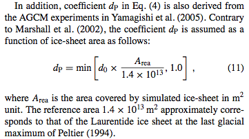 So dp is a parameter that attempts to account for increasing aridity in colder glacial conditions, and in their 2002 paper Marshall et al describe it as 1 of 4 “free parameters” that are investigated to see what effect they have on ice sheet development around the LGM.