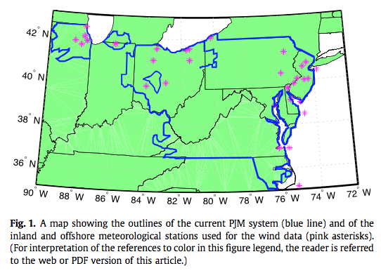 We simplify our grid model by assuming perfect transmission within PJM (sometimes called a “copper plate” assumption), and no transmission to adjacent grids. We also simplify by ignoring reserve requirements, within-hourly fluctuations and ramp rates; these would be easily covered with the amount of fast storage contemplated here. In addition, we assume no preloading of storage from fossil (based on forecasting) and no demand-side management. Adding transmission would raise the costs of the renewable systems calculated here, whereas using adjacent grids, demand management, and forecasting all would lower costs. We judge the latter factors substantially larger, and thus assert (without calculation) that the net effect of adding all these factors together would not raise the costs per kWh above those we calculate below.