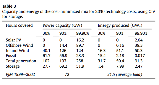 I like their approach. What is clear is that finding the best cost solution depends heavily on the cost of storage, and the mix is radically different for different storage costs. Again, it is the intermittent nature of renewables for the region in question that shapes the result.