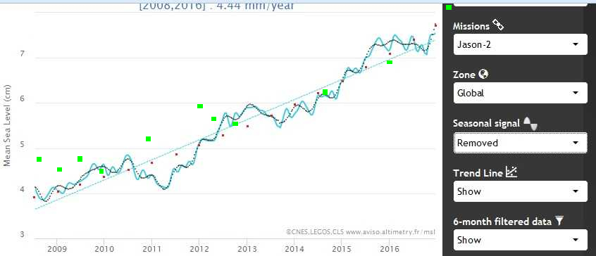 JCH: “The global mean sea level trend for the period 1993-2014 from TOPEX, Jason-1, and Jason-2 is 2.8 and 3.0 mm/year using GFZ VER6 and VER11 orbits, respectively.”