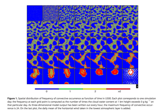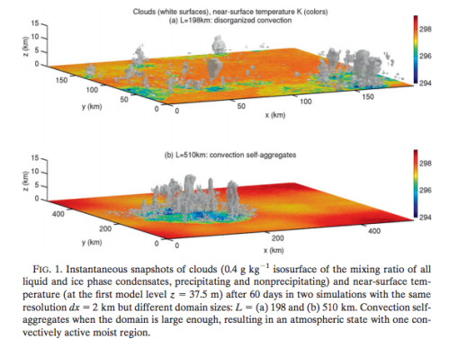 From the results in their paper we might think that self-aggregation of convection was a model artifact that disappears with higher resolution models (they are careful not to really conclude this). Tompkins & Semie 2017 suggested that Muller & Held’s results may be just a dependence on their sub-grid parameterization scheme (see note 1).