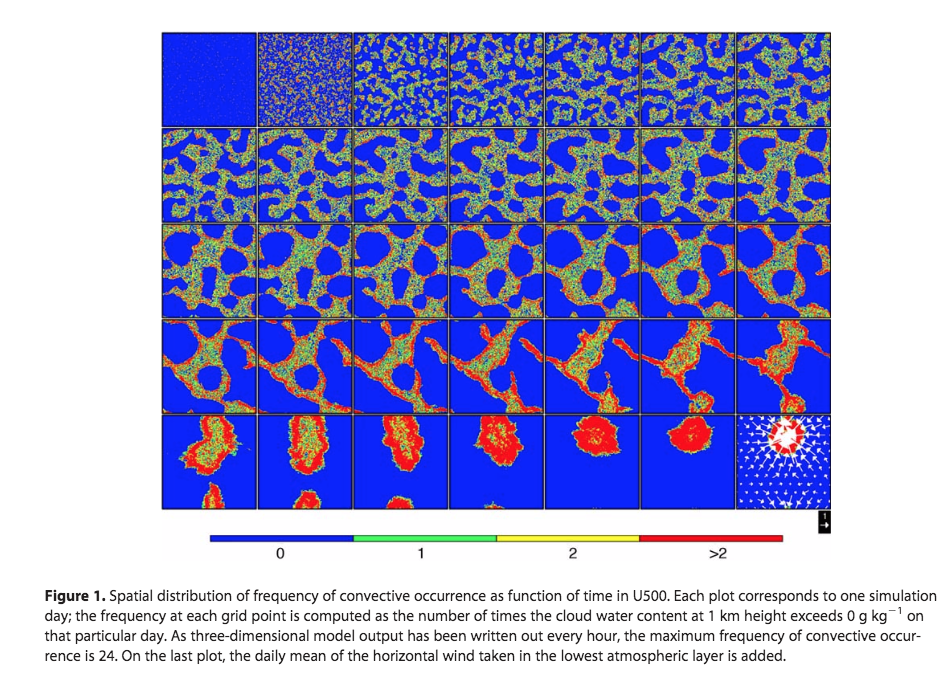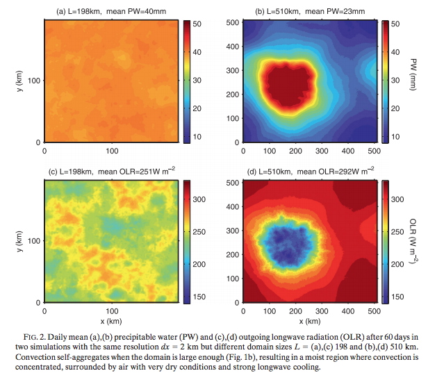 From the results in their paper we might think that self-aggregation of convection was a model artifact that disappears with higher resolution models (they are careful not to really conclude this). Tompkins & Semie 2017 suggested that Muller & Held’s results may be just a dependence on their sub-grid parameterization scheme (see note 1).