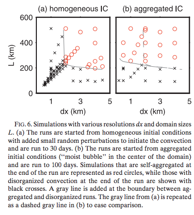 Then they look at varying model resolution (dx), domain size (L) and also the initial conditions. The higher resolution models don’t produce the self-aggregation, but the results are also sensitive to domain size and initial conditions. The black crosses denote model runs where the convection stayed disorganized, the red circles where the convection self-aggregated: