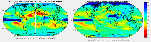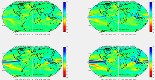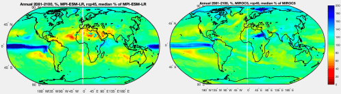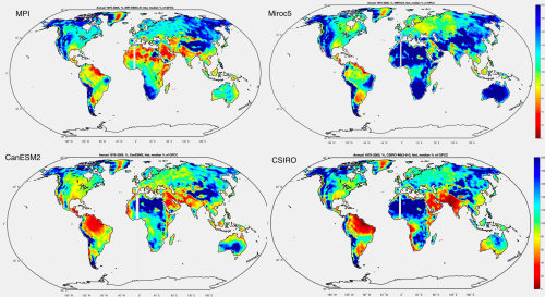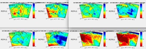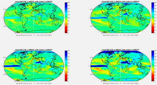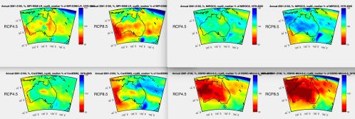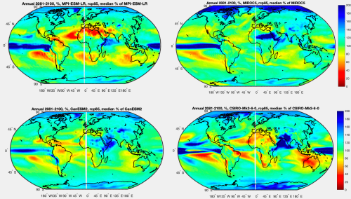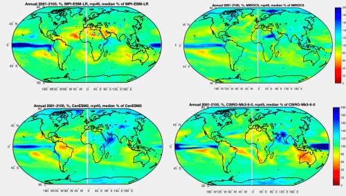 Each pair of graphs is future RCP4.5 as % of recent past, and RCP8.5 as % of recent past. The four models, clockwise from top left – MPI (Germany), Miroc (Japan), CSIRO (Australia) and CAN (Canada):