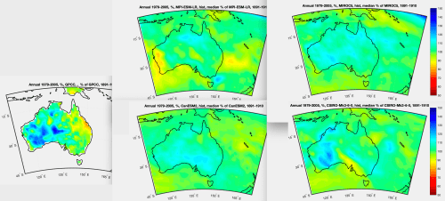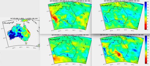 In VI – Australia CanESM2, CSIRO, Miroc and MRI compared vs history we looked at how each model thought rainfall had changed in Australia over about 100 years, and we compared that to observations. We did this for annual rainfall, also for Australian summer (Dec, Jan, Feb) and Australian winter (Jun, Jul, Aug).