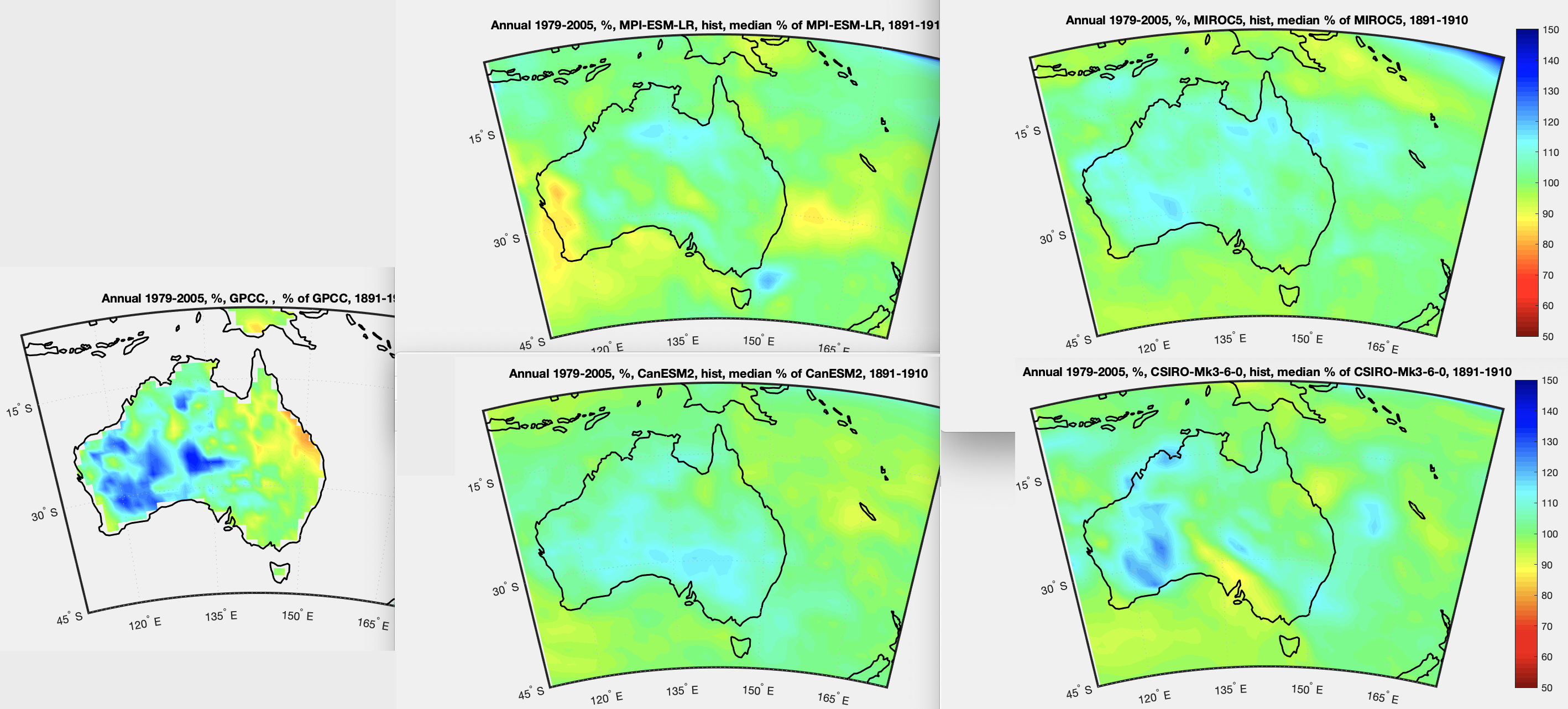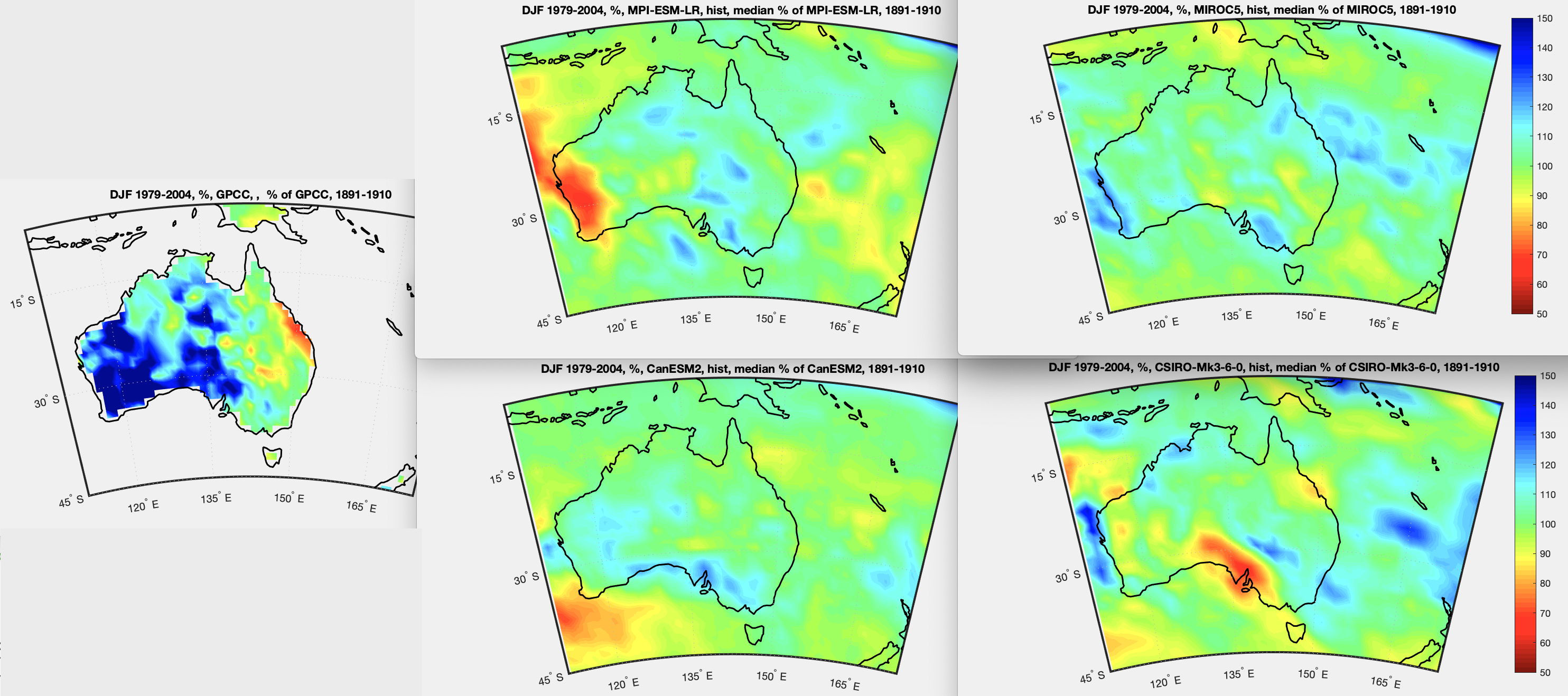 In VI – Australia CanESM2, CSIRO, Miroc and MRI compared vs history we looked at how each model thought rainfall had changed in Australia over about 100 years, and we compared that to observations. We did this for annual rainfall, also for Australian summer (Dec, Jan, Feb) and Australian winter (Jun, Jul, Aug).