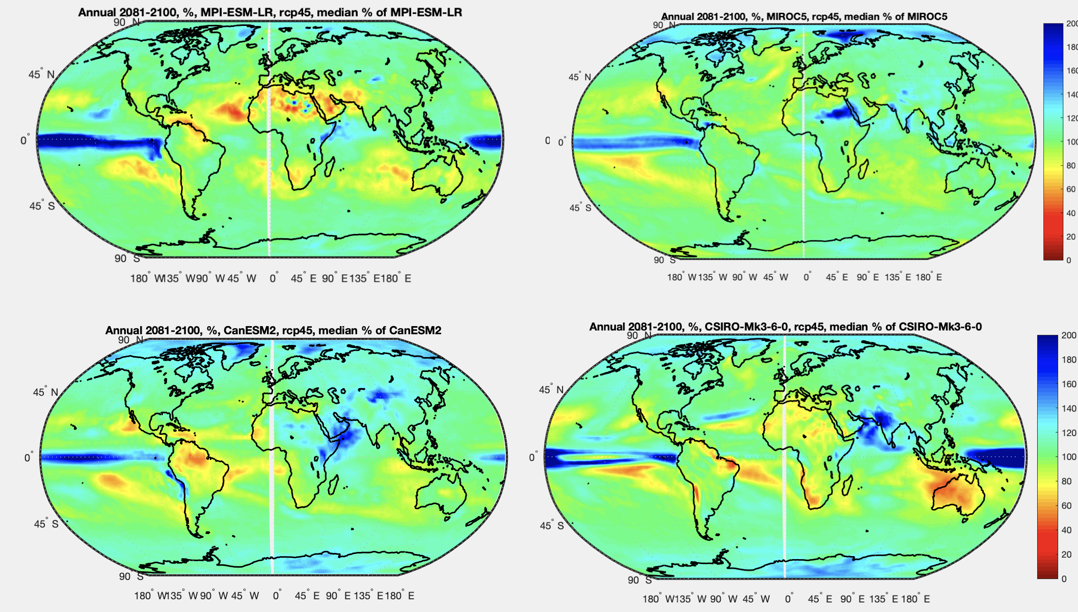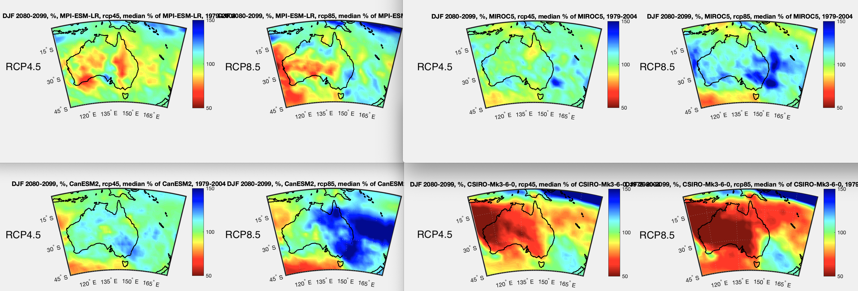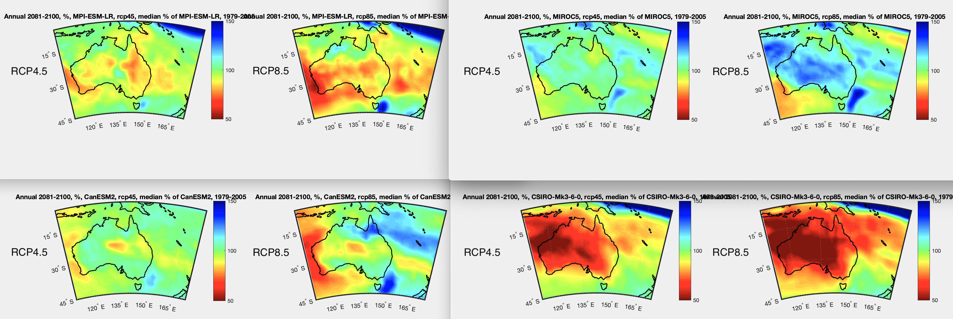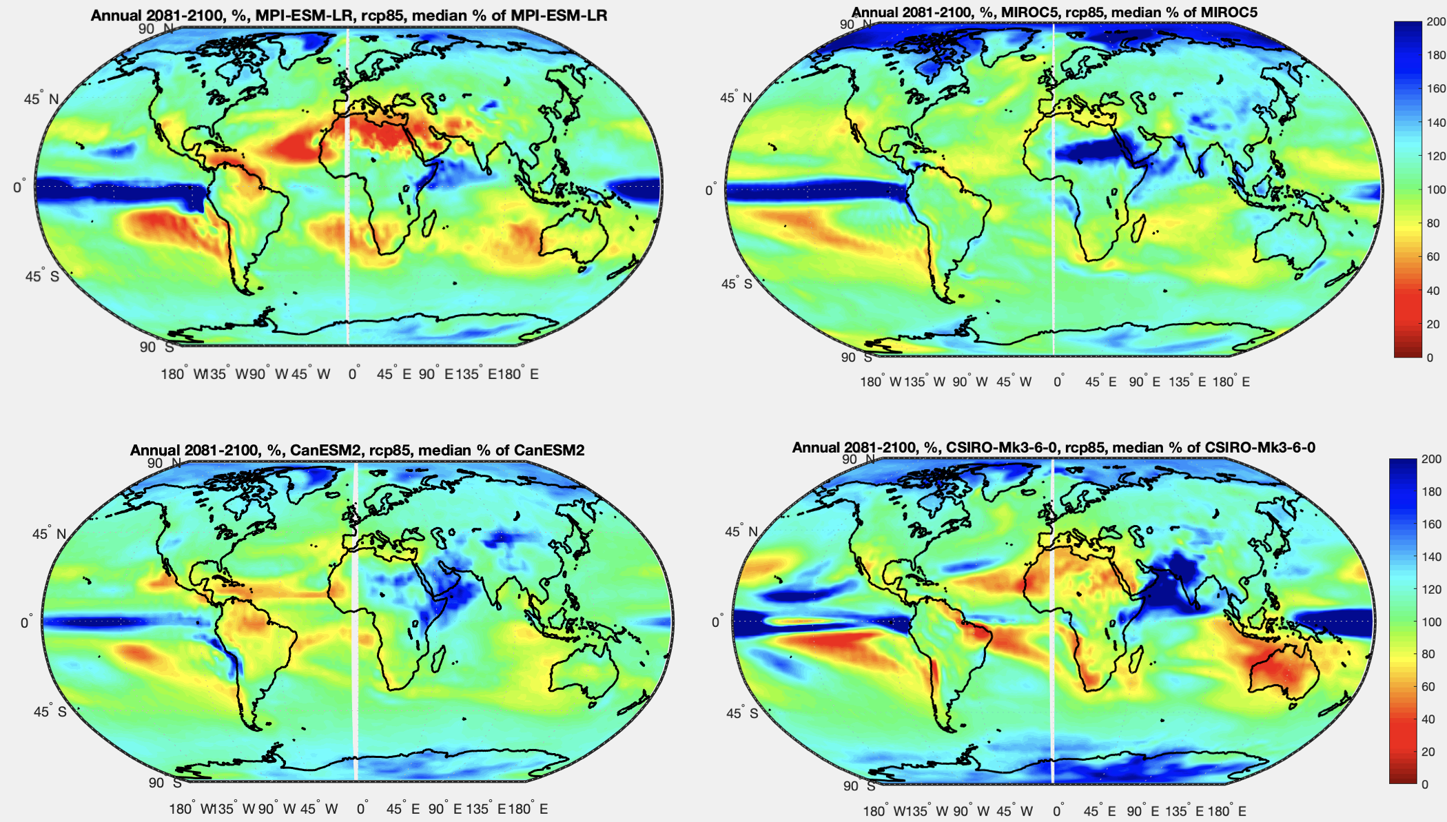 Each pair of graphs is future RCP4.5 as % of recent past, and RCP8.5 as % of recent past. The four models, clockwise from top left – MPI (Germany), Miroc (Japan), CSIRO (Australia) and CAN (Canada):