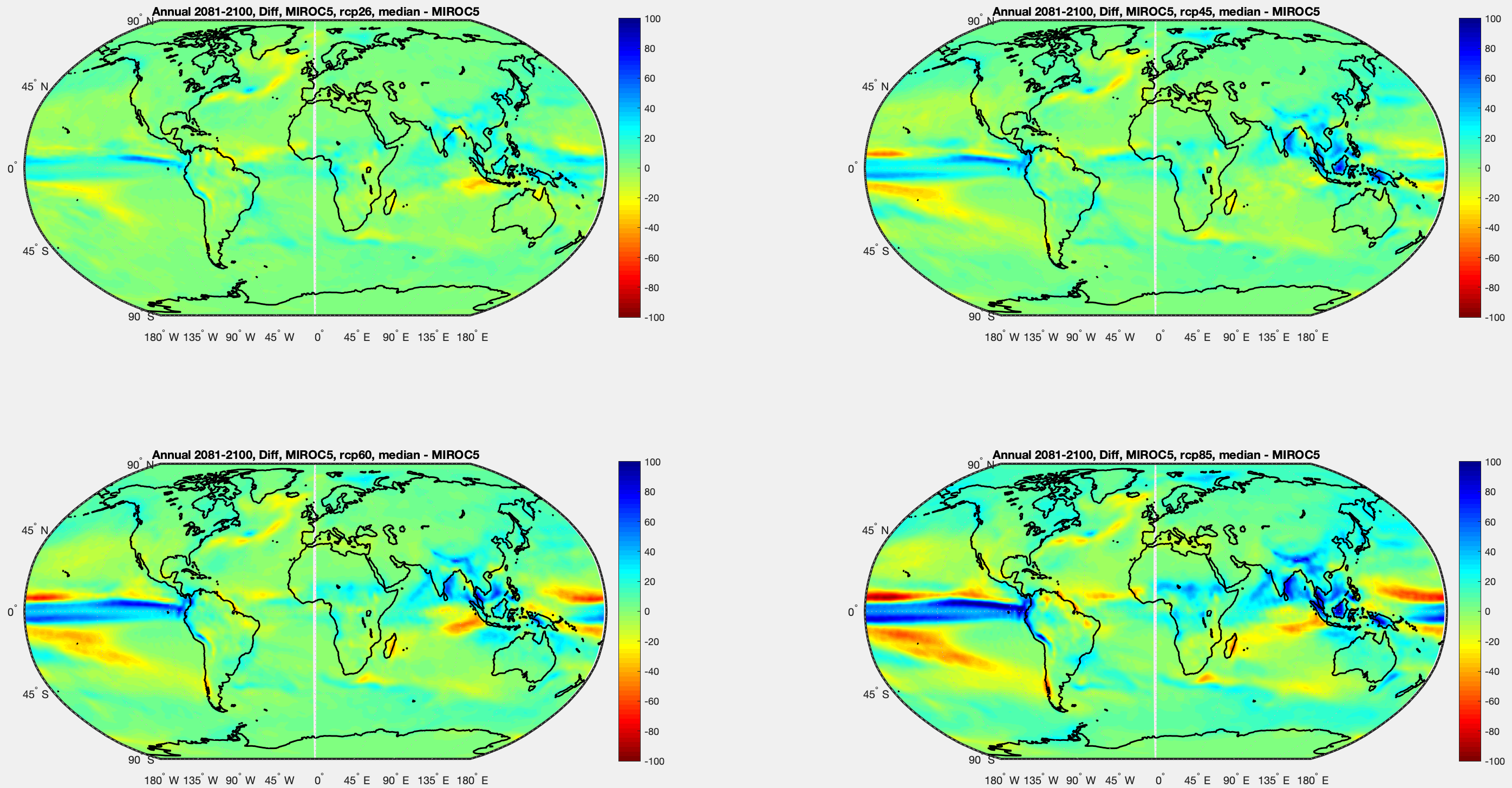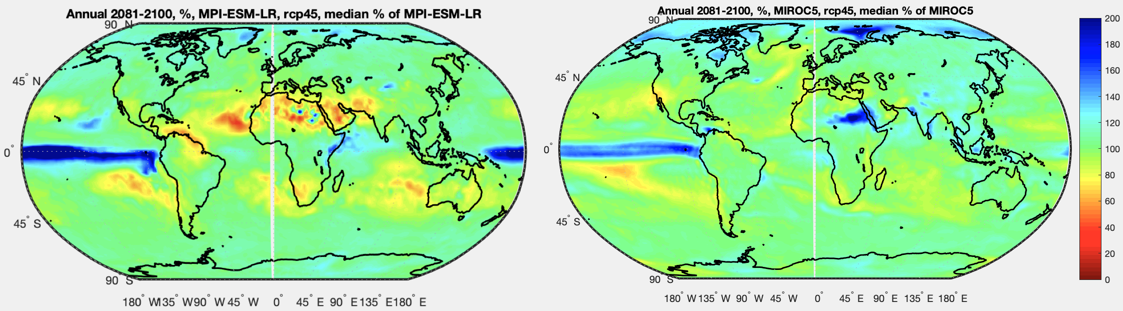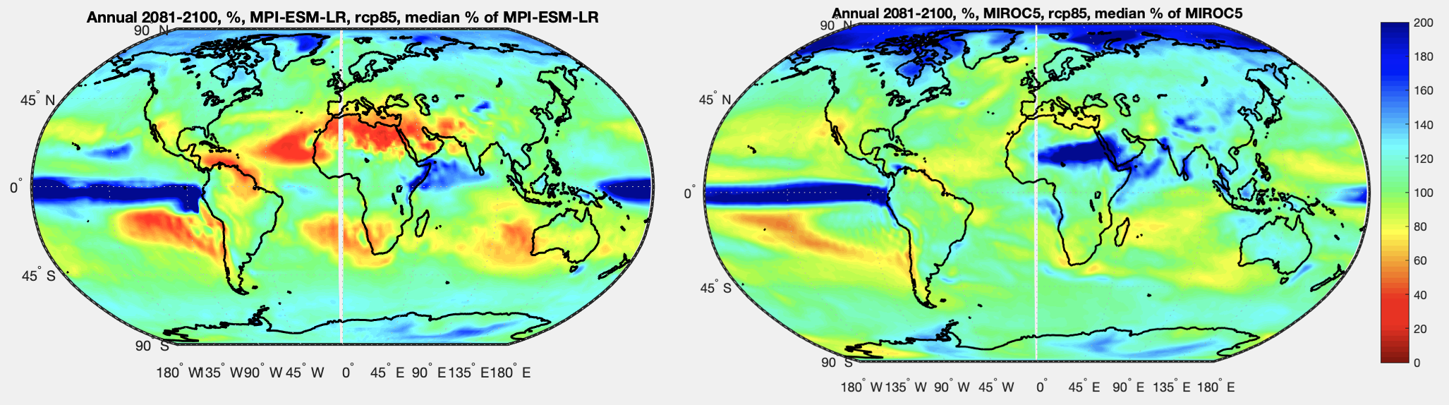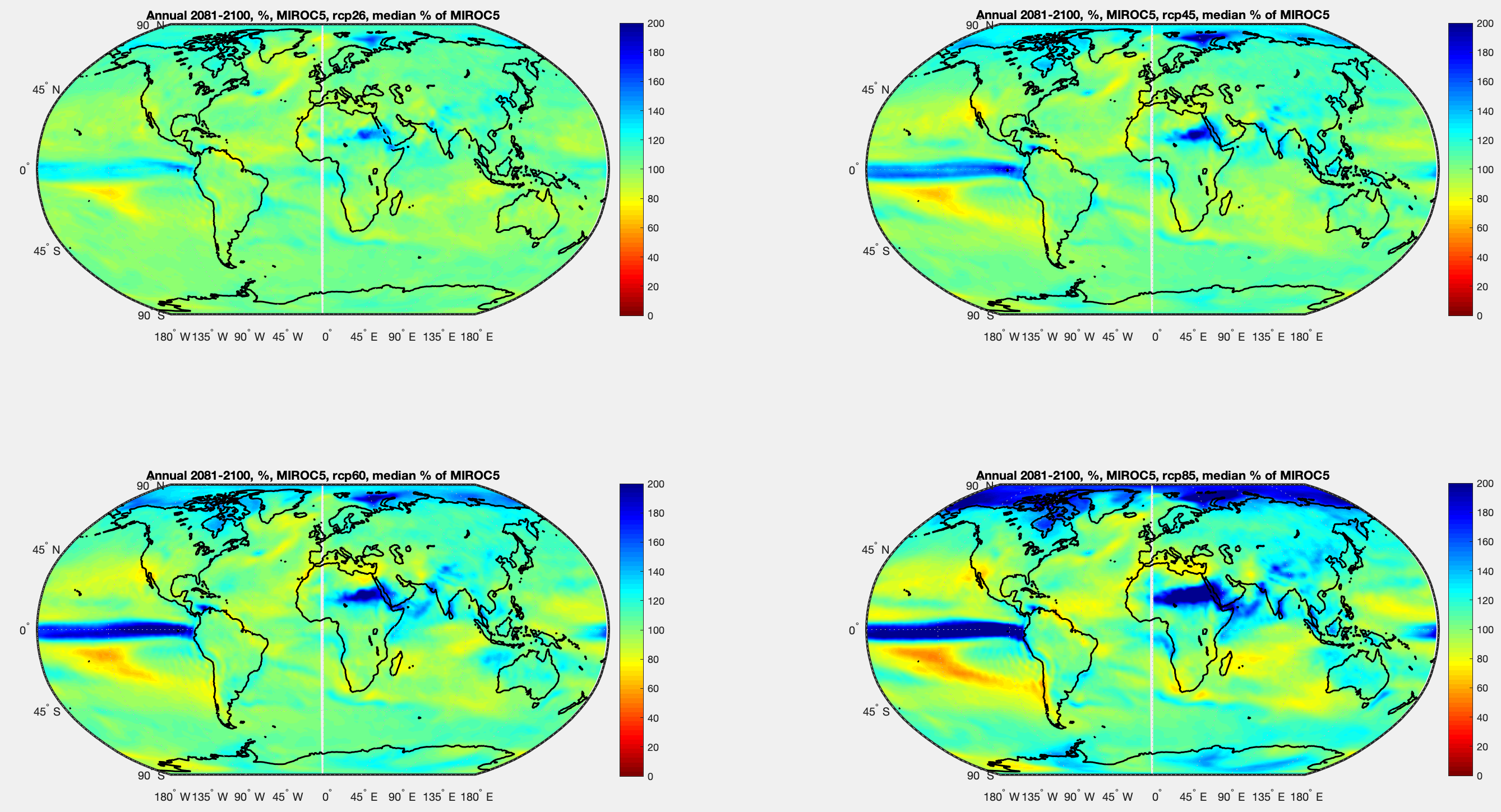 Each pair of graphs is future RCP4.5 as % of recent past, and RCP8.5 as % of recent past. The four models, clockwise from top left – MPI (Germany), Miroc (Japan), CSIRO (Australia) and CAN (Canada):