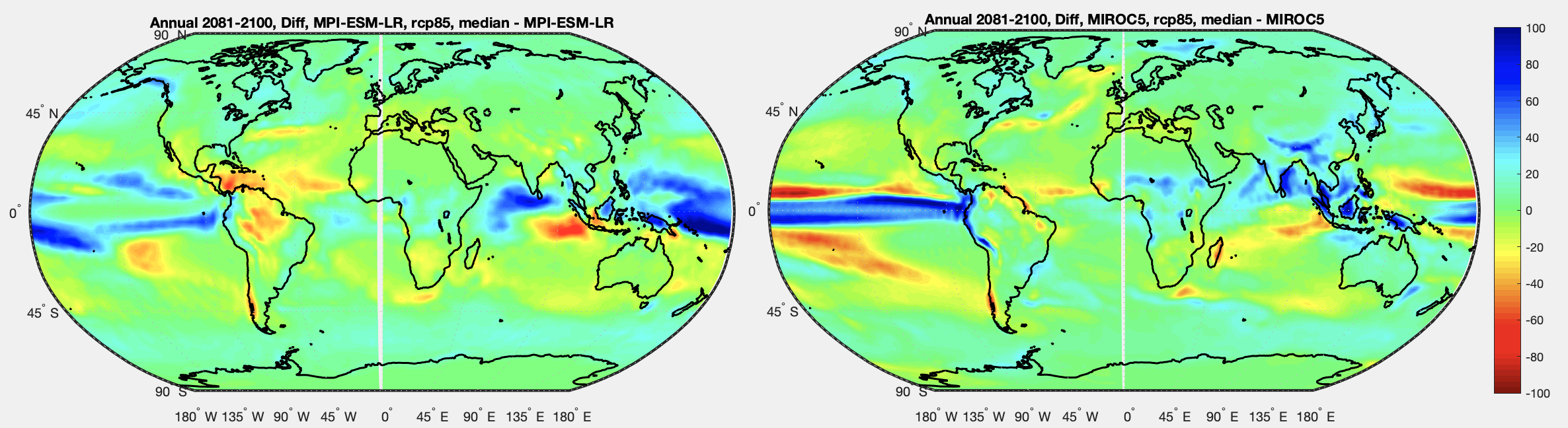 Note that we are not comparing the end of the 21st century from the model with observations at the end of the 20th century. That produces much different results – the model’s view of recent history doesn’t match observations very well. We are comparing the model future with the model past. So we are asking the model to say how it sees rainfall changing as a result of different amounts of CO2 being emitted.