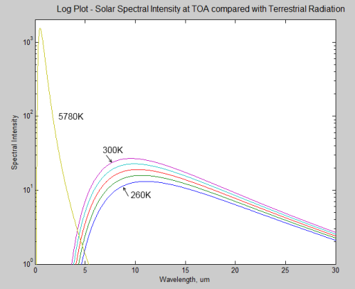 What the second law tells us, particularly in the above Clausius form, is that the net spontaneous energy exchange describing the flow of each chunk of incoming energy to the atmosphere MUST ALWAYS BE IN THE DIRECTION OF DECREASING TEMPERATURE. Heat flows “downhill” from high to low temperature regions. The incoming energy starts from the star – very high temperature. If it’s absorbed it’s somewhere in the atmosphere or the planetary surface, and from that point it must go through successfully colder and colder portions of the system before it can escape to space (where the temperature is 2.7 K).