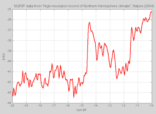 Here are two high resolution examples from a Greenland ice core (NGRIP) during the last glaciation: