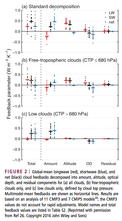 Then they break down the cloud feedback further. This graph is well worth understanding. For example, in the second graph (b) we are looking at higher altitude clouds. We see that the increasing altitude of high clouds causes a positive feedback. The red dots are LW (longwave = terrestrial radiation). If high clouds increase in altitude the radiation from these clouds to space is lower because the cloud tops are colder. This is a positive feedback (more warming retained in the climate system). The blue dots are SW (shortwave = solar radiation). If high clouds increase in altitude it has no effect on the reflection of solar radiation – and so the blue dots are on zero.