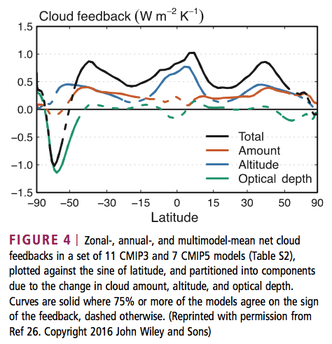 And the cloud feedback by latitude broken down into: altitude effects; amount of cloud; and optical depth (higher optical depth primarily increases the reflection to space of solar radiation but also has an effect on terrestrial radiation).