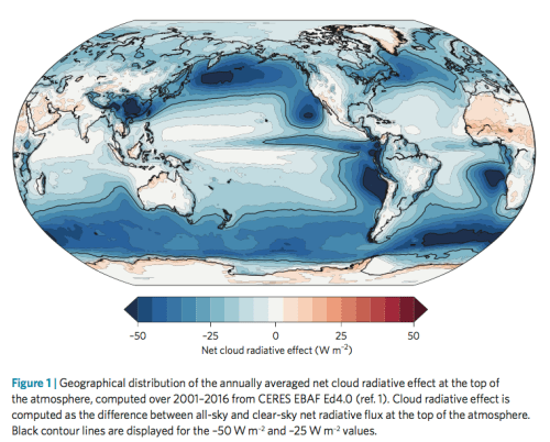 Note that the cloud radiative effect shown above isn’t feedbacks from warming, it is simply the current effect of clouds. The big question is how this will change with warming.