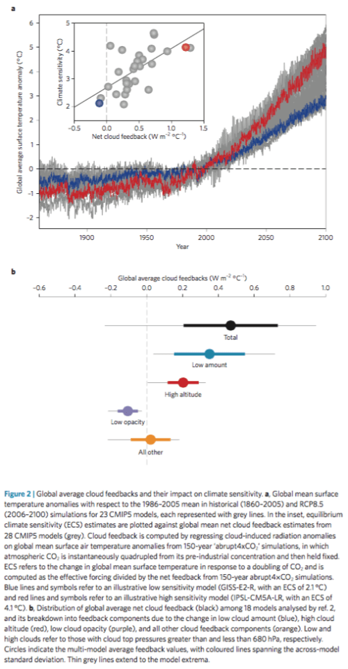 In the next graphic, the inset in the top shows cloud feedback (note 1) vs ECS from 28 GCMs. ECS is the steady state temperature resulting from doubling CO2. Two models are picked out – red and blue – and in the main graph we see simulated warming under RCP8.5 (an unlikely future world confusing described by many as the “business as usual” scenario).