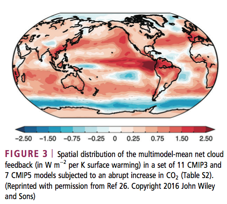 Note that the cloud radiative effect shown above isn’t feedbacks from warming, it is simply the current effect of clouds. The big question is how this will change with warming.
