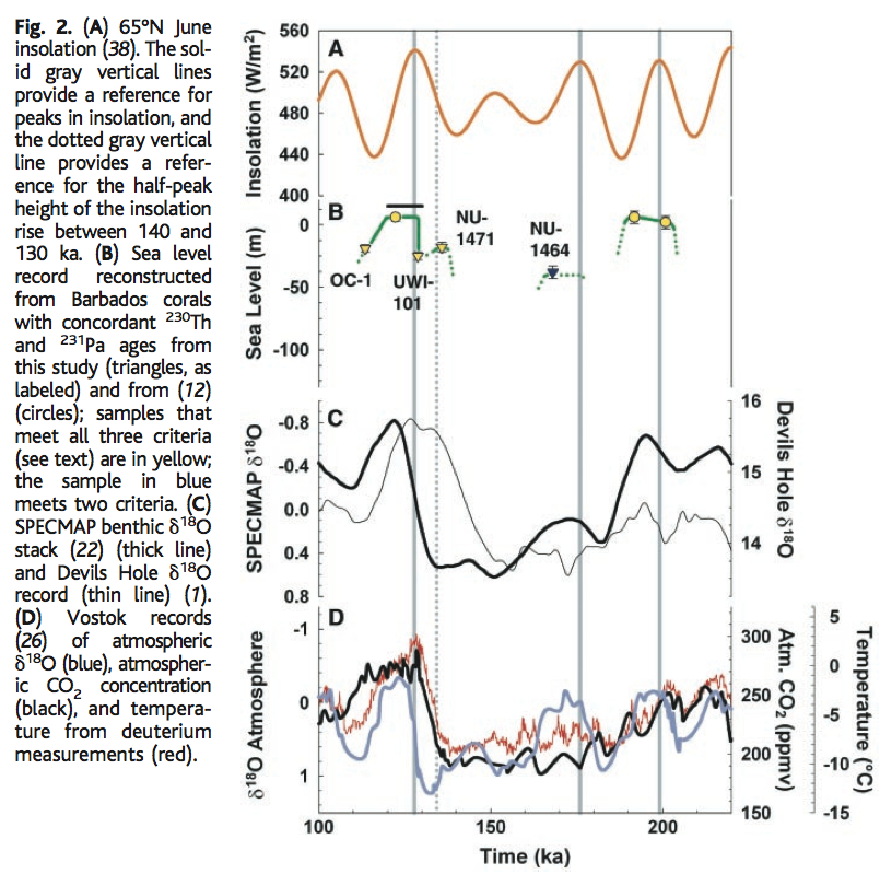 Figure 2B summarizes the sea level record suggested by the new data. Most significantly our record includes corals that document sea level directly during Termination II, suggesting that the majority (~80%) of the Termination II sea level rise occurred before 135 ka. This is broadly consistent with early shifts in δ18O recorded in the Bahamas and Devils Hole and with early dates (134 ka) of last interglacial corals from Hawaii, which call into question the timing of Termination II in the SPECMAP record..