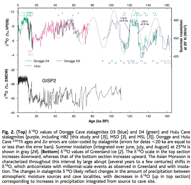 Note 6 – There are a number of papers based on Dongge and Hulu caves in China that have similar data and conclusions but I am still trying to understand them. They attempt to tease out the relationship between δ18O and the monsoonal conditions and it’s involved. These papers include: Kelly et al 2006, High resolution characterization of the Asian Monsoon between 146,000 and 99,000 years B.P. from Dongge Cave, China and global correlation of events surrounding Termination II; Wang et al 2008, Millennial- and orbital-scale changes in the East Asian monsoon over the past 224,000 years.